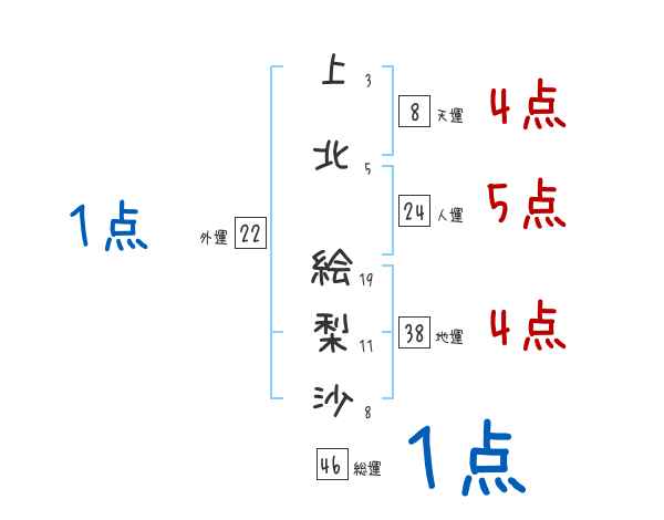 天運![]() | 上北絵梨沙さんの天運は8画の4つ星!勤勉家。根気強く努力し成功する。忍耐力がある。 家系が持つ宿命的な運勢を表します。祖先から受け継いだ苗字ですので自分の力が及びません。家柄を象徴します。 |