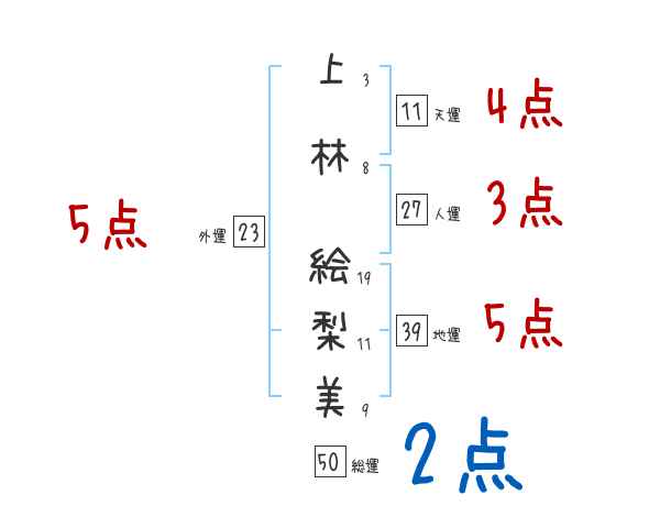 外運![]() | 上林絵梨美さんの外運は23画の5つ星!想像力に優れ活力がある。一代で成功し名誉を手に入れる。 生活面を象徴する運勢です。外部から受ける影響力を表し、結婚運、家庭運や職場、環境への順応性を表します。 |