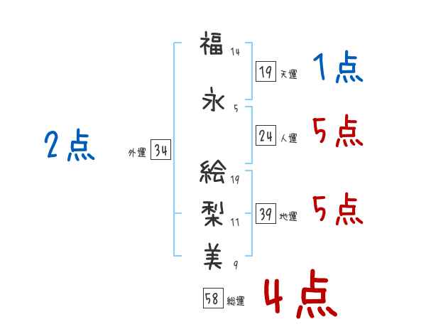 外運![]() | 福永絵梨美さんの外運は34画の2つ星!独創性に優れるが、自尊心が強く災難に注意しましょう。 生活面を象徴する運勢です。外部から受ける影響力を表し、結婚運、家庭運や職場、環境への順応性を表します。 |