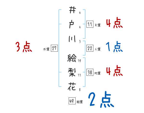 天運![]() | 井戸川絵梨花さんの天運は11画の4つ星!着実に富や地位を得る幸運な人生。 家系が持つ宿命的な運勢を表します。祖先から受け継いだ苗字ですので自分の力が及びません。家柄を象徴します。 |