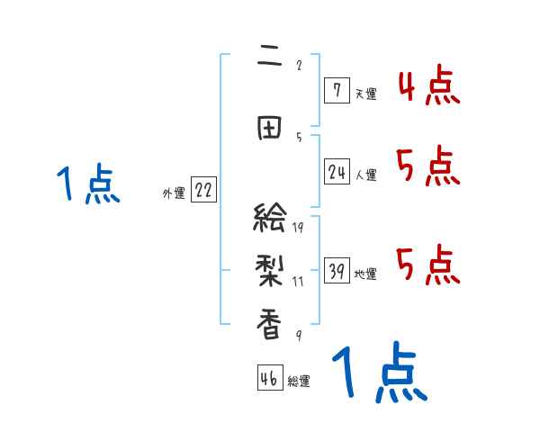 総運![]() | 二田絵梨香さんの総運は46画の1つ星!迷走することが多く苦労するかも。目先のことにとらわれないように。 あなたの人生を表す1番重要な運勢です。生涯を通じて影響する総合運となり、主に50歳以降の晩年期に影響を及ぼします。 |
