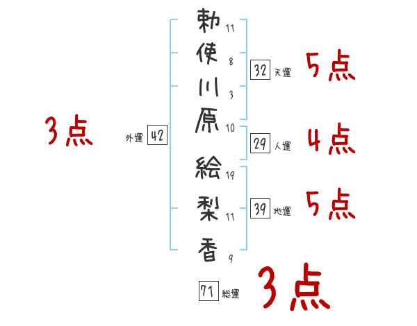 天運![]() | 勅使川原絵梨香さんの天運は32画の5つ星!柔軟性があり成功する。チャンスが多く金運が良い。 家系が持つ宿命的な運勢を表します。祖先から受け継いだ苗字ですので自分の力が及びません。家柄を象徴します。 |