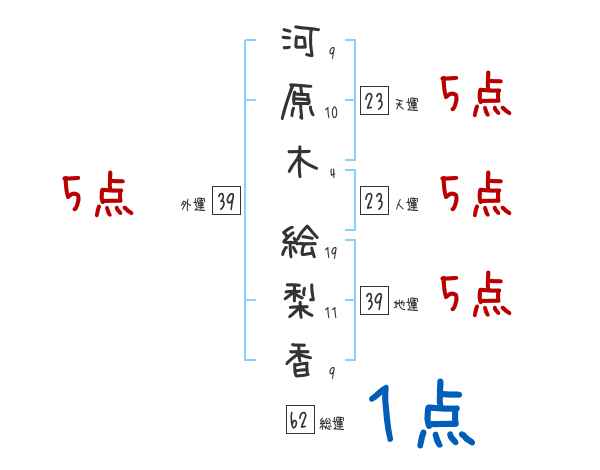 外運![]() | 河原木絵梨香さんの外運は39画の5つ星!社交性に優れ人望が厚い。人の上に立ち成功する。 生活面を象徴する運勢です。外部から受ける影響力を表し、結婚運、家庭運や職場、環境への順応性を表します。 |