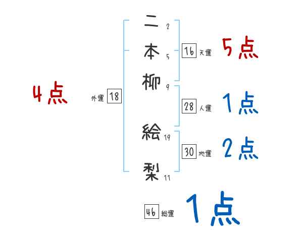 総運![]() | 二本柳絵梨さんの総運は46画の1つ星!迷走することが多く苦労するかも。目先のことにとらわれないように。 あなたの人生を表す1番重要な運勢です。生涯を通じて影響する総合運となり、主に50歳以降の晩年期に影響を及ぼします。 |