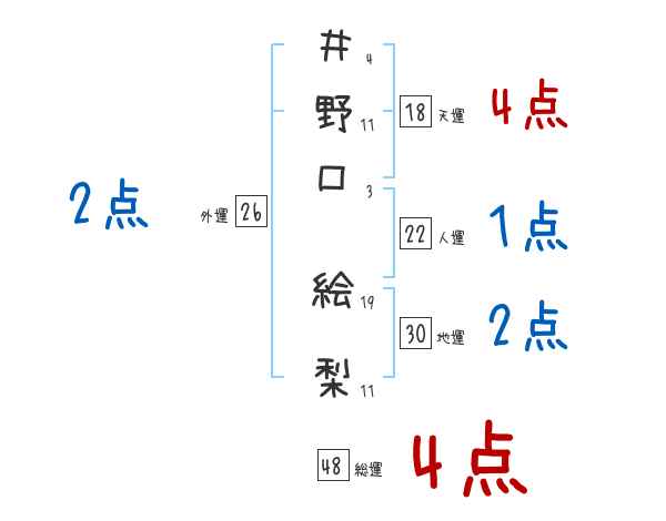 天運![]() | 井野口絵梨さんの天運は18画の4つ星!情熱的で剛気。忍耐力があり信頼される。 家系が持つ宿命的な運勢を表します。祖先から受け継いだ苗字ですので自分の力が及びません。家柄を象徴します。 |