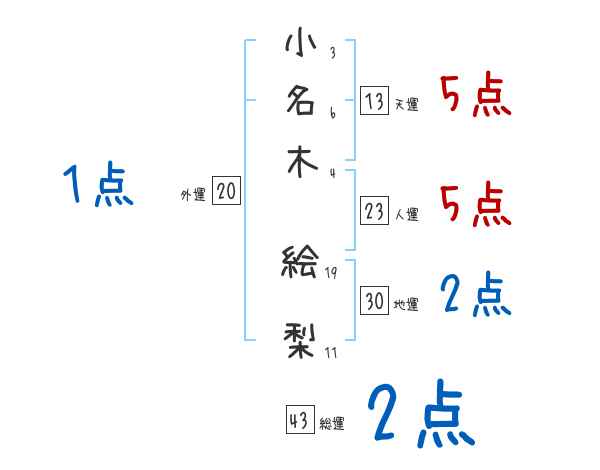 総運![]() | 小名木絵梨さんの総運は43画の2つ星!頑固な性格で独立心が強いかも。やや非現実的で浪費に注意しましょう。 あなたの人生を表す1番重要な運勢です。生涯を通じて影響する総合運となり、主に50歳以降の晩年期に影響を及ぼします。 |