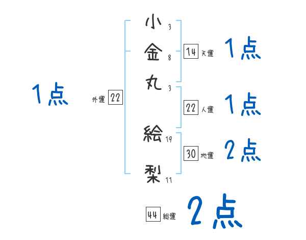 外運![]() | 小金丸絵梨さんの外運は22画の1つ星!努力することが苦手ないっぽう手先が器用。芸術性にも優れる。 生活面を象徴する運勢です。外部から受ける影響力を表し、結婚運、家庭運や職場、環境への順応性を表します。 |