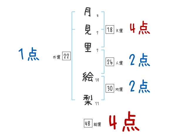天運![]() | 月見里絵梨さんの天運は18画の4つ星!情熱的で剛気。忍耐力があり信頼される。 家系が持つ宿命的な運勢を表します。祖先から受け継いだ苗字ですので自分の力が及びません。家柄を象徴します。 |