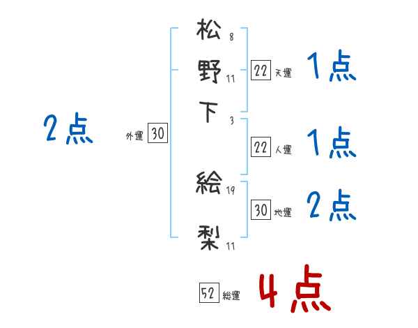 天運![]() | 松野下絵梨さんの天運は22画の1つ星!努力することが苦手ないっぽう手先が器用。芸術性にも優れる。 家系が持つ宿命的な運勢を表します。祖先から受け継いだ苗字ですので自分の力が及びません。家柄を象徴します。 |