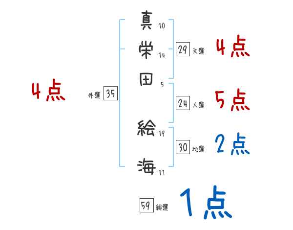 人運![]() | 真栄田絵海さんの人運は24画の5つ星!家庭運が良く順調な人生。金運にも恵まれる。 性格や才能などを表す2番目に重要な運勢です。人間関係や協調性、社会的な成功に影響します。主に20歳から50歳ぐらいまでの中年期の運勢を表します。 |