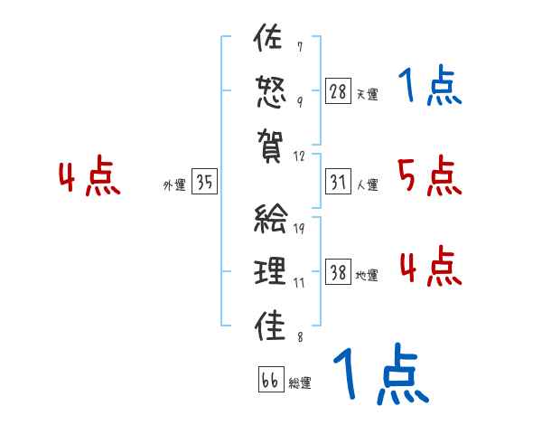 外運![]() | 佐怒賀絵理佳さんの外運は35画の4つ星!温厚な性格で感受性が高い。穏和な性格で人望が厚い。 生活面を象徴する運勢です。外部から受ける影響力を表し、結婚運、家庭運や職場、環境への順応性を表します。 |