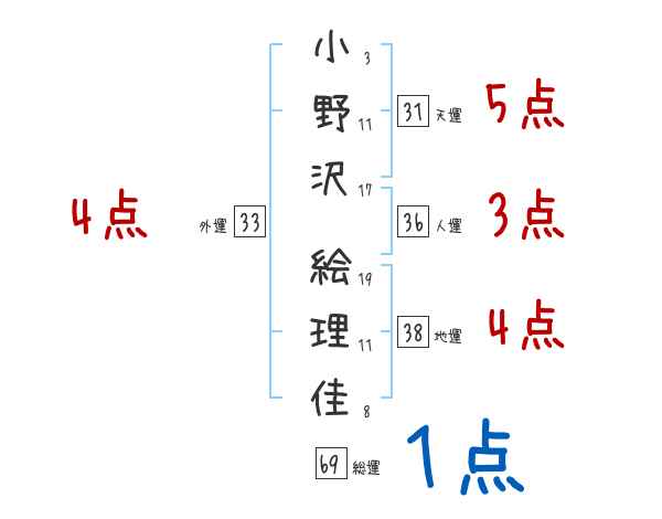 外運![]() | 小野沢絵理佳さんの外運は33画の4つ星!権力志向でプライドが高い。勇気があり運を切り開き成功する。 生活面を象徴する運勢です。外部から受ける影響力を表し、結婚運、家庭運や職場、環境への順応性を表します。 |