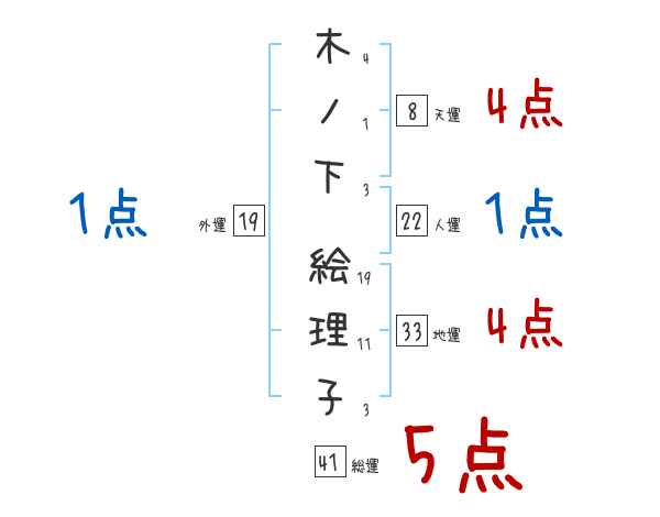 天運![]() | 木ノ下絵理子さんの天運は8画の4つ星!勤勉家。根気強く努力し成功する。忍耐力がある。 家系が持つ宿命的な運勢を表します。祖先から受け継いだ苗字ですので自分の力が及びません。家柄を象徴します。 |