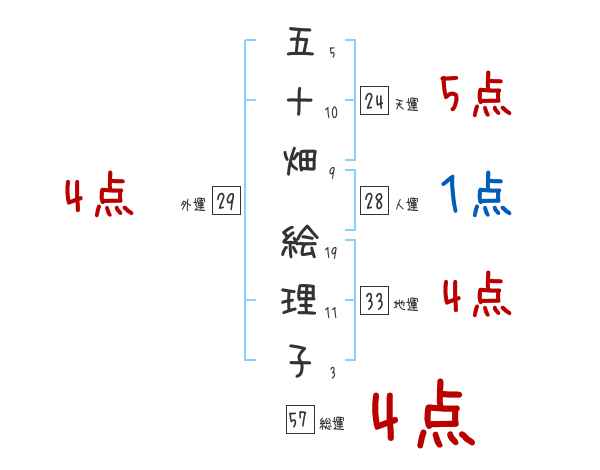 外運![]() | 五十畑絵理子さんの外運は29画の4つ星!完全主義で才能がある。厳格な心の持ち主。 生活面を象徴する運勢です。外部から受ける影響力を表し、結婚運、家庭運や職場、環境への順応性を表します。 |