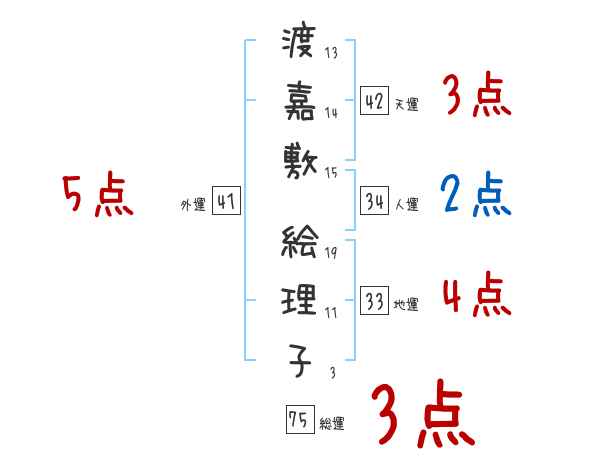 総運![]() | 渡嘉敷絵理子さんの総運は75画の3つ星!慎重な性格で保守的。 あなたの人生を表す1番重要な運勢です。生涯を通じて影響する総合運となり、主に50歳以降の晩年期に影響を及ぼします。 |
