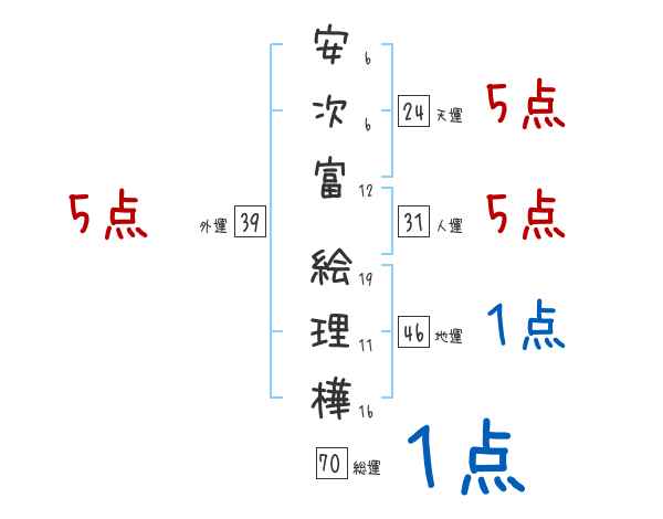 人運![]() | 安次富絵理樺さんの人運は31画の5つ星!社交性があり判断力に優れる。順風満帆な人生で円満な生活。 性格や才能などを表す2番目に重要な運勢です。人間関係や協調性、社会的な成功に影響します。主に20歳から50歳ぐらいまでの中年期の運勢を表します。 |