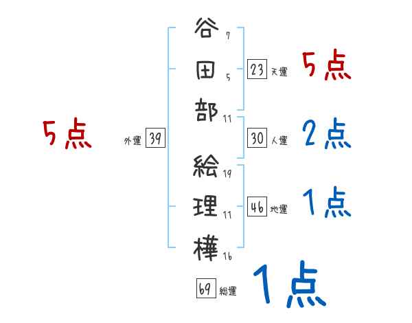 天運![]() | 谷田部絵理樺さんの天運は23画の5つ星!想像力に優れ活力がある。一代で成功し名誉を手に入れる。 家系が持つ宿命的な運勢を表します。祖先から受け継いだ苗字ですので自分の力が及びません。家柄を象徴します。 |