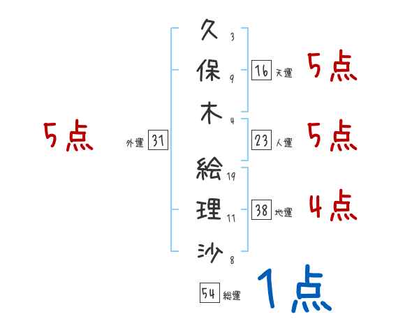 総運![]() | 久保木絵理沙さんの総運は54画の1つ星!トラブルが多いかも。周りをよく見て協調して過ごしましょう。 あなたの人生を表す1番重要な運勢です。生涯を通じて影響する総合運となり、主に50歳以降の晩年期に影響を及ぼします。 |