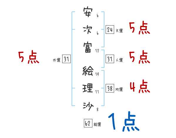 天運![]() | 安次富絵理沙さんの天運は24画の5つ星!家庭運が良く順調な人生。金運にも恵まれる。 家系が持つ宿命的な運勢を表します。祖先から受け継いだ苗字ですので自分の力が及びません。家柄を象徴します。 |
