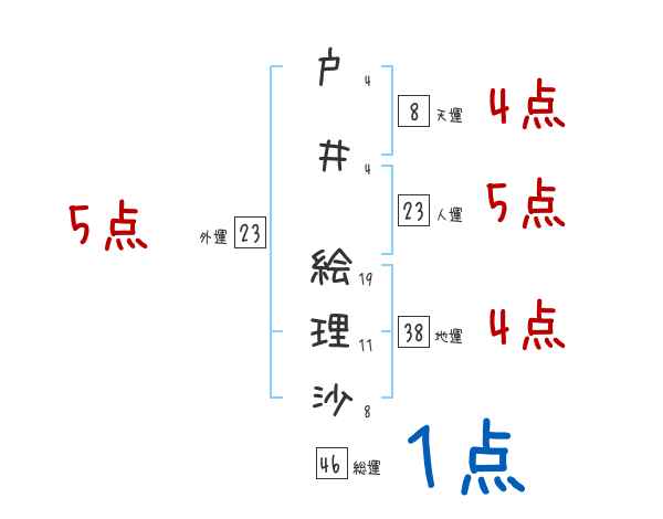 外運![]() | 戸井絵理沙さんの外運は23画の5つ星!想像力に優れ活力がある。一代で成功し名誉を手に入れる。 生活面を象徴する運勢です。外部から受ける影響力を表し、結婚運、家庭運や職場、環境への順応性を表します。 |