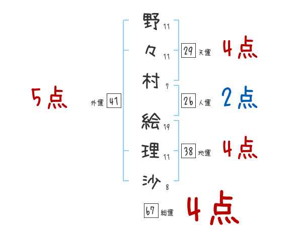 天運![]() | 野々村絵理沙さんの天運は29画の4つ星!完全主義で才能がある。厳格な心の持ち主。 家系が持つ宿命的な運勢を表します。祖先から受け継いだ苗字ですので自分の力が及びません。家柄を象徴します。 |