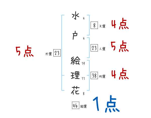 | 人運  | 水戸絵理花さんの人運は23画の5つ星!想像力に優れ活力がある。一代で成功し名誉を手に入れる。性格や才能などを表す2番目に重要な運勢です。人間関係や協調性、社会的な成功に影響します。主に20歳から50歳ぐらいまでの中年期の運勢を表します。 |