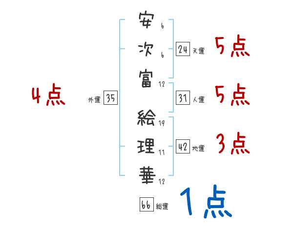外運![]() | 安次富絵理華さんの外運は35画の4つ星!温厚な性格で感受性が高い。穏和な性格で人望が厚い。 生活面を象徴する運勢です。外部から受ける影響力を表し、結婚運、家庭運や職場、環境への順応性を表します。 |