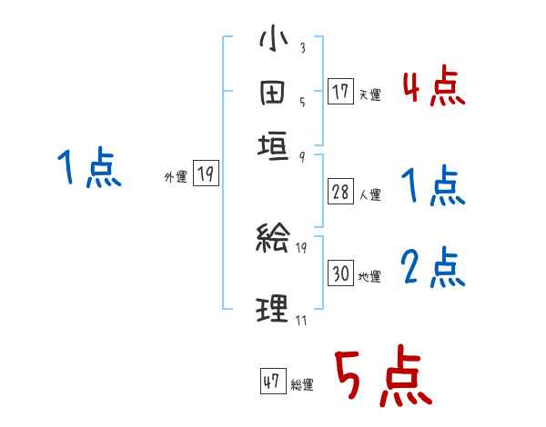 総運![]() | 小田垣絵理さんの総運は47画の5つ星!実力が開花し発展する円満な人生。財に恵まれる。 あなたの人生を表す1番重要な運勢です。生涯を通じて影響する総合運となり、主に50歳以降の晩年期に影響を及ぼします。 |
