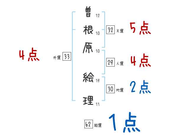 天運![]() | 曽根原絵理さんの天運は32画の5つ星!柔軟性があり成功する。チャンスが多く金運が良い。 家系が持つ宿命的な運勢を表します。祖先から受け継いだ苗字ですので自分の力が及びません。家柄を象徴します。 |