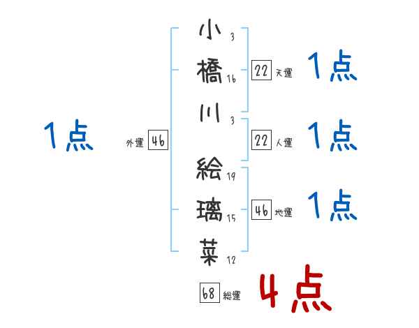 外運![]() | 小橋川絵璃菜さんの外運は46画の1つ星!迷走することが多く苦労するかも。目先のことにとらわれないように。 生活面を象徴する運勢です。外部から受ける影響力を表し、結婚運、家庭運や職場、環境への順応性を表します。 |