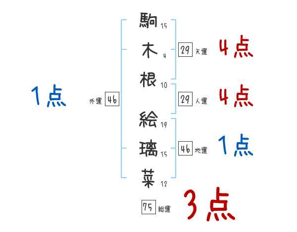総運![]() | 駒木根絵璃菜さんの総運は75画の3つ星!慎重な性格で保守的。 あなたの人生を表す1番重要な運勢です。生涯を通じて影響する総合運となり、主に50歳以降の晩年期に影響を及ぼします。 |