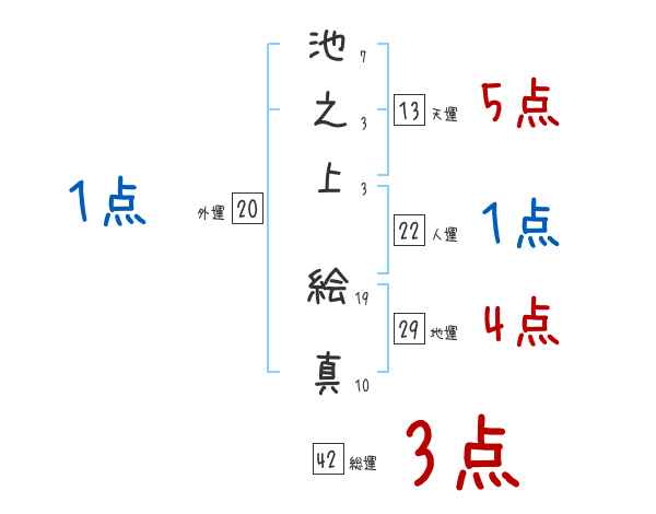 天運![]() | 池之上絵真さんの天運は13画の5つ星!才能に恵まれ人気がある。名声を手に入れる。円満な人生。 家系が持つ宿命的な運勢を表します。祖先から受け継いだ苗字ですので自分の力が及びません。家柄を象徴します。 |
