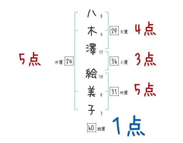 人運![]() | 八木澤絵美子さんの人運は36画の3つ星!先見性が豊かです。多少神経質で苦労することも。 性格や才能などを表す2番目に重要な運勢です。人間関係や協調性、社会的な成功に影響します。主に20歳から50歳ぐらいまでの中年期の運勢を表します。 |