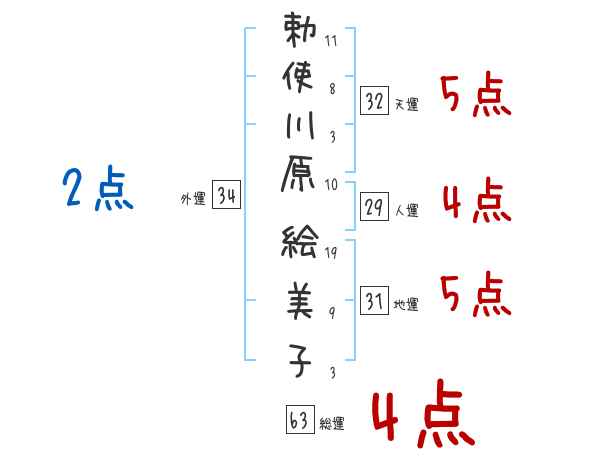 天運![]() | 勅使川原絵美子さんの天運は32画の5つ星!柔軟性があり成功する。チャンスが多く金運が良い。 家系が持つ宿命的な運勢を表します。祖先から受け継いだ苗字ですので自分の力が及びません。家柄を象徴します。 |