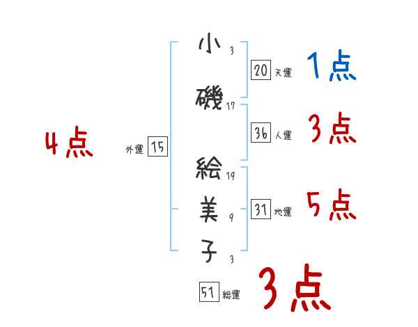 外運![]() | 小磯絵美子さんの外運は15画の4つ星!人徳があり出世する。順調に物事を進め円満な人生。 生活面を象徴する運勢です。外部から受ける影響力を表し、結婚運、家庭運や職場、環境への順応性を表します。 |