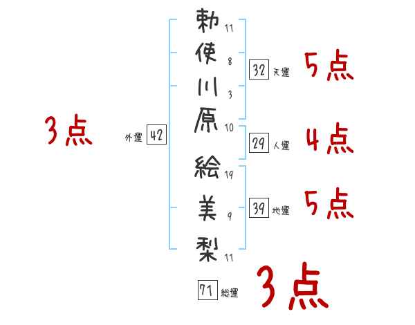 天運![]() | 勅使川原絵美梨さんの天運は32画の5つ星!柔軟性があり成功する。チャンスが多く金運が良い。 家系が持つ宿命的な運勢を表します。祖先から受け継いだ苗字ですので自分の力が及びません。家柄を象徴します。 |