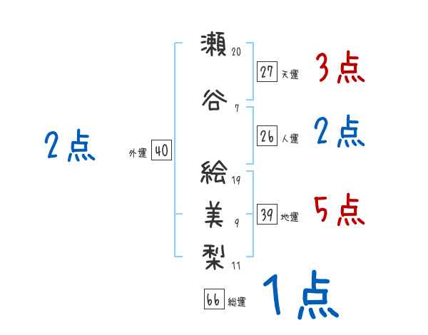 総運![]() | 瀬谷絵美梨さんの総運は66画の1つ星!迷うことが多く挫折しやすい傾向が。辛抱強く物事に取り組みましょう。 あなたの人生を表す1番重要な運勢です。生涯を通じて影響する総合運となり、主に50歳以降の晩年期に影響を及ぼします。 |