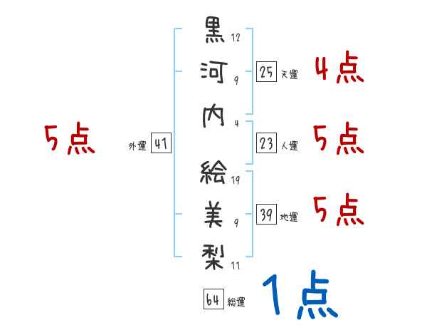 天運![]() | 黒河内絵美梨さんの天運は25画の4つ星!個性があり才能があふれる。強運の持ち主で発展する。 家系が持つ宿命的な運勢を表します。祖先から受け継いだ苗字ですので自分の力が及びません。家柄を象徴します。 |