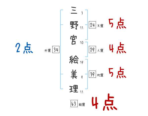 総運![]() | 三野宮絵美理さんの総運は63画の4つ星!家庭運がよく順調な生活。温和な性格。 あなたの人生を表す1番重要な運勢です。生涯を通じて影響する総合運となり、主に50歳以降の晩年期に影響を及ぼします。 |