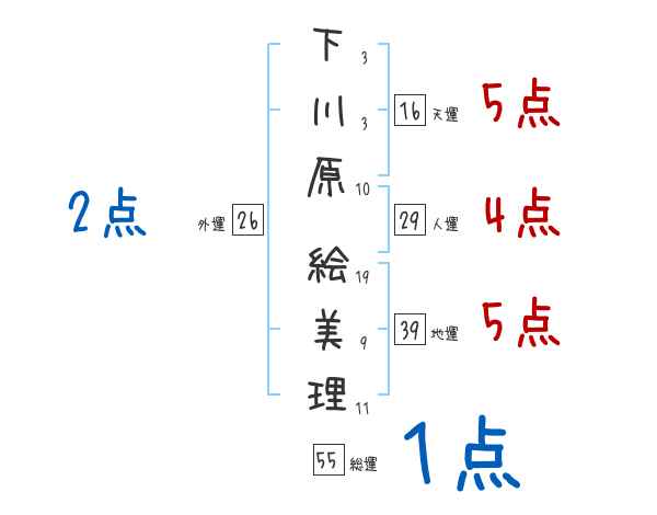 天運![]() | 下川原絵美理さんの天運は16画の5つ星!人望が厚く大きく発展する。逆転成功が見える。 家系が持つ宿命的な運勢を表します。祖先から受け継いだ苗字ですので自分の力が及びません。家柄を象徴します。 |