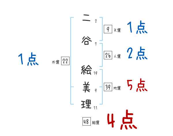天運![]() | 二谷絵美理さんの天運は9画の1つ星!消極的で才能を発揮することが苦手なことも。周りの意見に耳を傾けましょう。 家系が持つ宿命的な運勢を表します。祖先から受け継いだ苗字ですので自分の力が及びません。家柄を象徴します。 |