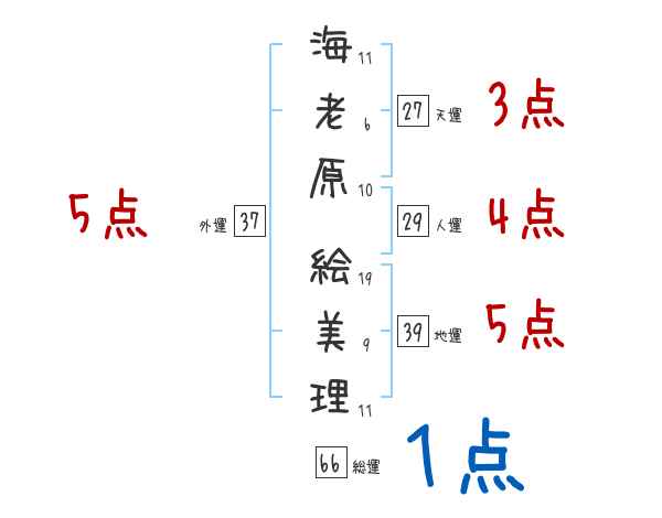 天運![]() | 海老原絵美理さんの天運は27画の3つ星!頭脳明晰だが強情で摩擦が多い傾向。孤立に注意。 家系が持つ宿命的な運勢を表します。祖先から受け継いだ苗字ですので自分の力が及びません。家柄を象徴します。 |