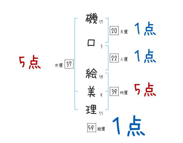 外運![]() | 磯口絵美理さんの外運は37画の5つ星!努力家で順応性に優れる。現実的な考え方ができ忠実に物事をこなす。 生活面を象徴する運勢です。外部から受ける影響力を表し、結婚運、家庭運や職場、環境への順応性を表します。 |