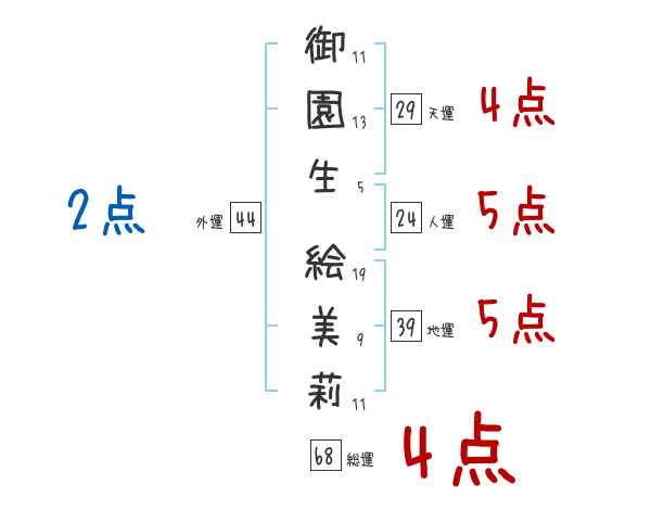 外運![]() | 御園生絵美莉さんの外運は44画の2つ星!誠実で慎重な性格。物事を考えすぎないように注意しましょう。 生活面を象徴する運勢です。外部から受ける影響力を表し、結婚運、家庭運や職場、環境への順応性を表します。 |