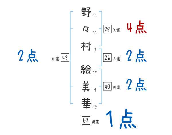 総運![]() | 野々村絵美華さんの総運は69画の1つ星!不満を感じやすい傾向が。ストレスを貯めないように注意しましょう。 あなたの人生を表す1番重要な運勢です。生涯を通じて影響する総合運となり、主に50歳以降の晩年期に影響を及ぼします。 |