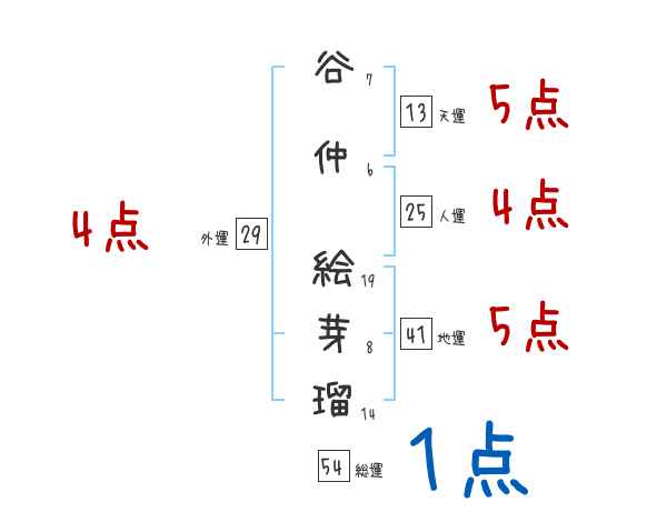 総運![]() | 谷仲絵芽瑠さんの総運は54画の1つ星!トラブルが多いかも。周りをよく見て協調して過ごしましょう。 あなたの人生を表す1番重要な運勢です。生涯を通じて影響する総合運となり、主に50歳以降の晩年期に影響を及ぼします。 |
