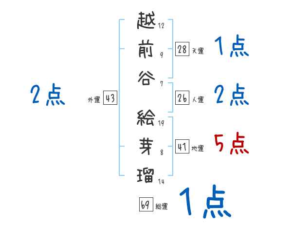 天運![]() | 越前谷絵芽瑠さんの天運は28画の1つ星!家庭環境に注意。スポーツで活躍できる能力があるかも。 家系が持つ宿命的な運勢を表します。祖先から受け継いだ苗字ですので自分の力が及びません。家柄を象徴します。 |