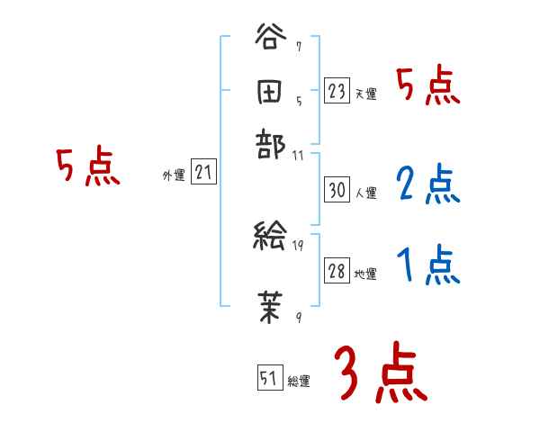 総運![]() | 谷田部絵茉さんの総運は51画の3つ星!変化が激しく、危険に注意。堅実な性格。 あなたの人生を表す1番重要な運勢です。生涯を通じて影響する総合運となり、主に50歳以降の晩年期に影響を及ぼします。 |