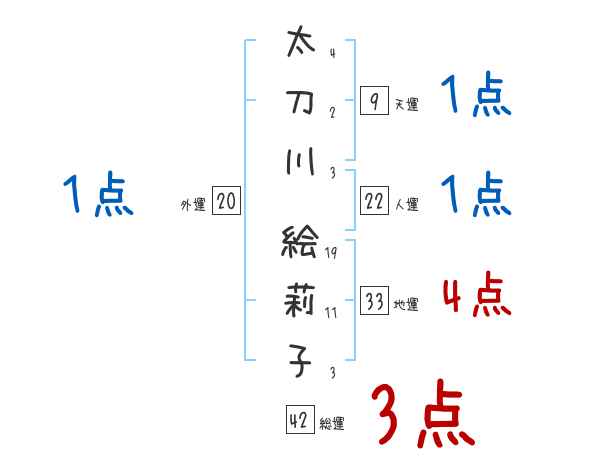 天運![]() | 太刀川絵莉子さんの天運は9画の1つ星!消極的で才能を発揮することが苦手なことも。周りの意見に耳を傾けましょう。 家系が持つ宿命的な運勢を表します。祖先から受け継いだ苗字ですので自分の力が及びません。家柄を象徴します。 |