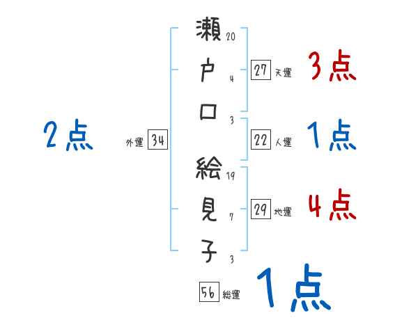 総運![]() | 瀬戸口絵見子さんの総運は56画の1つ星!消極的で無気力になりがち。誠実な気持ちが必要でしょう。 あなたの人生を表す1番重要な運勢です。生涯を通じて影響する総合運となり、主に50歳以降の晩年期に影響を及ぼします。 |